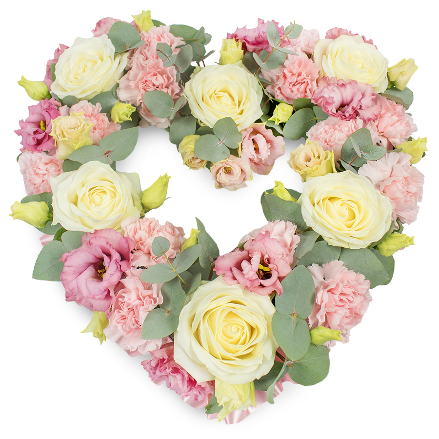 A tender heart-shaped wreath filled entirely with pastel flowers is set against a bright white background, its shape clear and beautifully defined. The arrangement is rich with creamy ivory and pale yellow roses, their petals layered into soft spirals that form gentle focal points along the heart. Around and between them, clusters of light pink carnations create a ruffled, cloud-like texture, making the design appear plush and comforting, almost like a floral pillow of support. Deeper pink and mauve lisianthus blooms are artfully placed throughout the heart, their open, cup-shaped petals adding deeper colour tones and a sense of emotional resonance. Woven around these blossoms, silvery-green eucalyptus leaves trace the contour of the heart, their rounded foliage and subdued hue bringing balance and calm to the composition. Small yellow-green buds peek out between the larger blooms, suggesting freshness and continuity. The soft, even lighting allows the pastel palette to glow gently without harsh contrast, reinforcing the tranquil atmosphere. For those in West Drayton, this arrangement feels perfectly in tune with a quiet farewell at a local church, a chapel near the station, or a peaceful gathering at home. It is the kind of heart tribute a family might choose for a funeral, memorial, or anniversary of a loved one's passing, conveying love, sympathy, and remembrance in a way that words cannot always manage. Designed with the care and attention of an experienced local florist, it offers a serene, dignified floral expression for difficult moments in the West Drayton community.